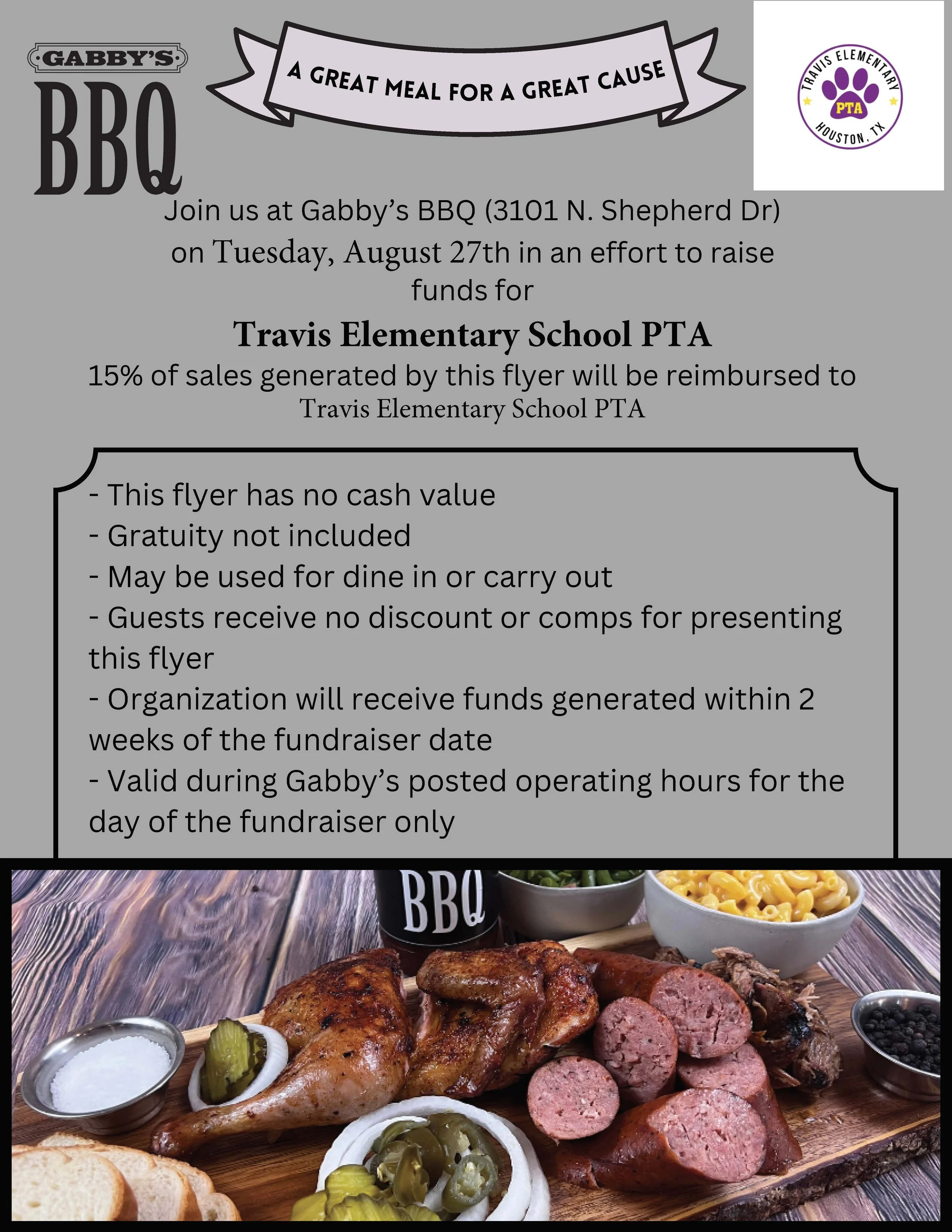 Don’t feel like cooking tonight? Help our school by dining in or ordering take-out from Gabby’s BBQ on N. Shepherd! Show this flyer or mention Travis Elementary to earn our school 15% of sales for Tuesday, August 27th, from 11am - 9pm. Thanks Gabby’s BBQ and go tigers!