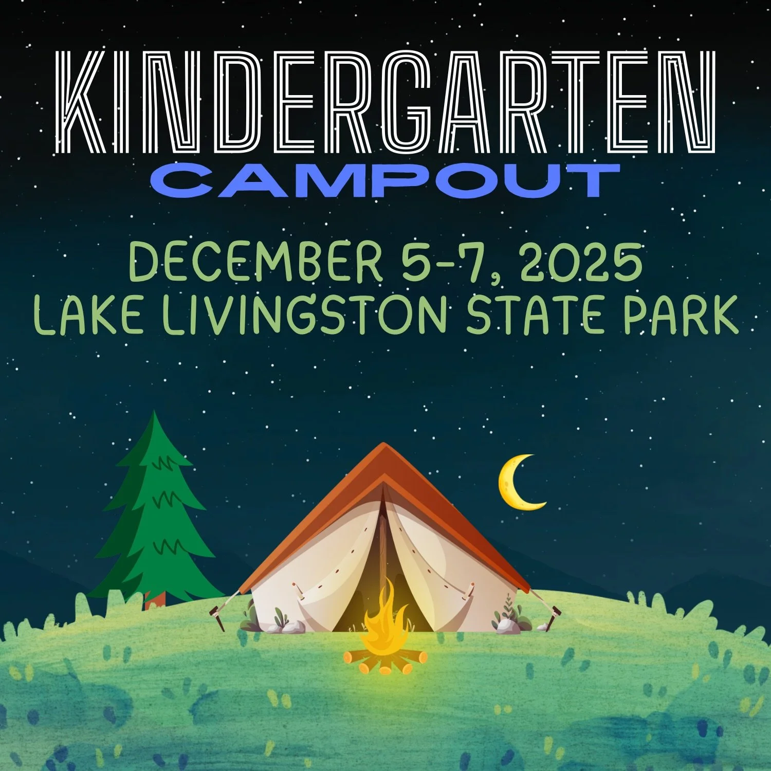 Kindergarten Campout Friday, December 5, 2025 9:00 PM 21:00 Sunday, December 7, 2025 9:00 AM 09:00 Lake Livingston State Park 300 State Park Road 65 Livingston, TX, 77351 United States (map) Google Calendar ICS PTA is proud to sponsor the annual Kindergarten Campout. Kindergarten teachers and room parents will have more info for parents as this event draws closer. Mark your calendars for December 5th-7th at Lake Livingston State Park.